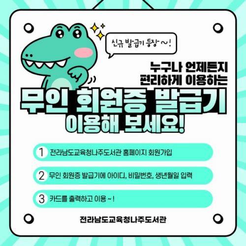 [½Åµ¿¾Æ¹æ¼Û Àü³²³ªÁÖ=À̽ŵ¿±âÀÚ] Àü¶ó³²µµ±³À°Ã»³ªÁÖµµ¼­°üÀº ¿À´Â 12¿ùºÎÅÍ ÀÌ¿ëÀÚµéÀÇ ÆíÀǸ¦ ±Ø´ëÈ­ÇϰíÀÚ ¹«ÀΠȸ¿øÁõ ¹ß±Þ ½Ã½ºÅÛÀ» µµÀÔÇÑ´Ù°í ¹àÇû´Ù. À̹ø¿¡ µµÀԵǴ ¹«ÀΠȸ¿øÁõ ¹ß±Þ ½Ã½ºÅÛÀº µðÁöÅÐ ½Ã´ë¿¡ ¹ß¸ÂÃç °³ÀÎÁ¤º¸ º¸È£¸¦ °­È­Çϰí, ÀÌ¿ëÀÚ Áß¡¦