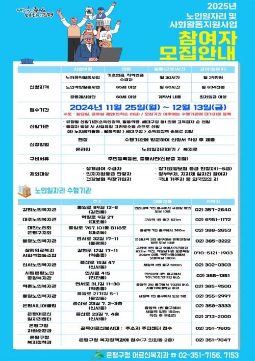 [½Åµ¿¾Æ¹æ¼Û ÀºÆò±¸=À̽ŵ¿±âÀÚ] ÀºÆò±¸´Â ¿À´Â 25ÀϺÎÅÍ ³»´Þ 13ÀϱîÁö ¡®2025³â ³ëÀÎÀÏÀÚ¸® ¹× »çȸȰµ¿Áö¿ø»ç¾÷¡¯ Âü¿©ÀÚ 5õ6¹é8½Ê7¸íÀ» ¸ðÁýÇÑ´Ù°í ¹àÇû´Ù. 2025³âµµ ³ëÀÎÀÏÀÚ¸®»ç¾÷Àº 2024³â ´ëºñ 4% Áõ°¡ÇßÀ¸¸ç, ÃÑ 12°³ ¼öÇà±â°ü¿¡¼­ 99°³ÀÇ »ç¾÷À» ÃßÁøÇÑ´Ù¡¦