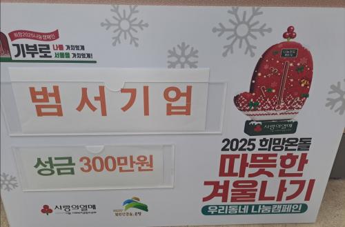 [½Åµ¿¾Æ¹æ¼Û ÀºÆò±¸=À̽ŵ¿±âÀÚ] ÀºÆò±¸ ºÒ±¤1µ¿Àº Áö³­ 25ÀÏ ¹ü¼­±â¾÷À¸·ÎºÎÅÍ ¡®µû¶æÇÑ °Ü¿ï³ª±â¡¯ Ä·ÆäÀÎ ¼º±Ý 3¹é¸¸ ¿øÀ» ±âºÎ¹Þ¾Ò´Ù°í ¹àÇû´Ù. ¹ü¼­±â¾÷Àº ºÐ±â¸¶´Ù ½ÒÀ» ÈÄ¿øÇϸç Áö¿ª»çȸ¸¦ À§ÇÑ ²ÙÁØÇÑ ³ª´®À» À̾°í ÀÖ´Â ±â¾÷ÀÌ´Ù. À̳²±Ô ¹ü¼­±â¾÷ ´ë¡¦