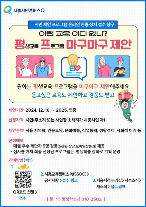 [½Åµ¿¾Æ¹æ¼Û ½ÃÈï½Ã=À̽ŵ¿±âÀÚ] ½ÃÈï½Ã´Â ½Ã¹ÎÀÇ ´Ù¾çÇÑ ¿ä±¸¸¦ ¹Ý¿µÇÑ ¸ÂÃãÇü Æò»ýÇнÀ ÇÁ·Î±×·¥À» ±âȹÇϰíÀÚ ¡®Æò»ýÇнÀ ÇÁ·Î±×·¥ ¸¶±¸¸¶±¸ Á¦¾È¡¯ ¿Â¶óÀÎ »ó½Ã Á¢¼ö ⱸ¸¦ ¿î¿µÇϸç, À̸¦ ÅëÇØ ¼±Á¤µÈ ½Ã¹Î Á¦¾È ÇÁ·Î±×·¥À» 2025³â ¿¬Áß ¿î¿µÇÒ °èȹÀÌ´Ù. ¡®Æò¡¦