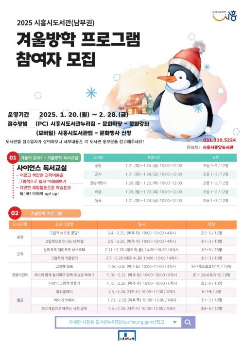 [½Åµ¿¾Æ¹æ¼Û ½ÃÈï½Ã=À̽ŵ¿±âÀÚ] ½ÃÈï½Ã Áß¾Óµµ¼­°üÀ» ºñ·ÔÇÑ ³²ºÎ±Ç 5°³ °ø°øµµ¼­°ü(Áß¾Ó, ±ºÀÚ, Á¤¿Õ¾î¸°ÀÌ, ¹è°ð, ¿ù°ù)ÀÌ °Ü¿ï¹æÇÐÀ» ¸Â¾Æ °Ü¿ï µ¶¼­±³½Ç°ú °Ü¿ï¹æÇÐ ÇÁ·Î±×·¥À» ³»³â 1¿ù 20ÀϺÎÅÍ 2¿ù 28ÀϱîÁö ¿î¿µÇÑ´Ù. ¸ÕÀú, ¡®°Ü¿ï¾Æ ÀÐÀÚ!-°Ü¿ïµ¶¼­±³½Ç¡¯¡¦