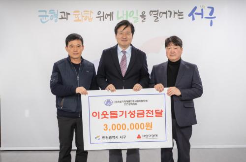[½Åµ¿¾Æ¹æ¼Û ÀÎõ= À±¹Î½Ä±âÀÚ] ÀÎõ ¼­±¸(±¸Ã»Àå °­¹ü¼®)´Â 12¿ù 27ÀÏ, (»ç)°Ç¼³±â°è°³º°¿¬¸Í»ç¾÷ÀÚÇùȸ ÀÎõ±¤¿ª½Ãȸ(ȸÀå ¿ÀÀçÈ£)·ÎºÎÅÍ ÀÌ¿ôµ½±â ¼º±Ý 300¸¸¿øÀ» Àü´Þ¹Þ¾Ò´Ù. À̳¯ Àü´Þ¹ÞÀº ¼º±ÝÀº ¼­±¸ Àú¼Òµæ ÁÖ¹ÎÀ» À§ÇØ ¾²ÀÏ ¿¹Á¤ÀÌ´Ù. (»ç)°Ç¼³±â°è¡¦