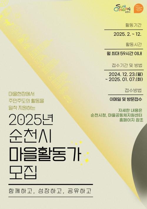 [½Åµ¿¾Æ¹æ¼Û ¼øÃµ=±è³²±â ±âÀÚ] ¼øÃµ½Ã(½ÃÀå ³ë°ü±Ô)´Â ¸¶À»°øµ¿Ã¼ ¹× ÁÖ¹ÎÀÚÄ¡ Ȱµ¿À» ÃËÁø¡¤¹ß±¼ÇÏ°í ¸¶À» ÇöÀå¿¡¼­ ÁÖ¹ÎÁÖµµÀÇ È°µ¿À» ¹ÐÂø Áö¿øÇÒ ¼øÃµ½Ã ¸¶À»È°µ¿°¡ 6¸íÀ» ¸ðÁýÇÑ´Ù°í ¹àÇû´Ù. ¸¶À»È°µ¿°¡´Â À§ÃËÀϷκÎÅÍ 2025³â 12¿ù±îÁö Ȱµ¿Çϸç, ÁֹεéÀÇ Âü¡¦