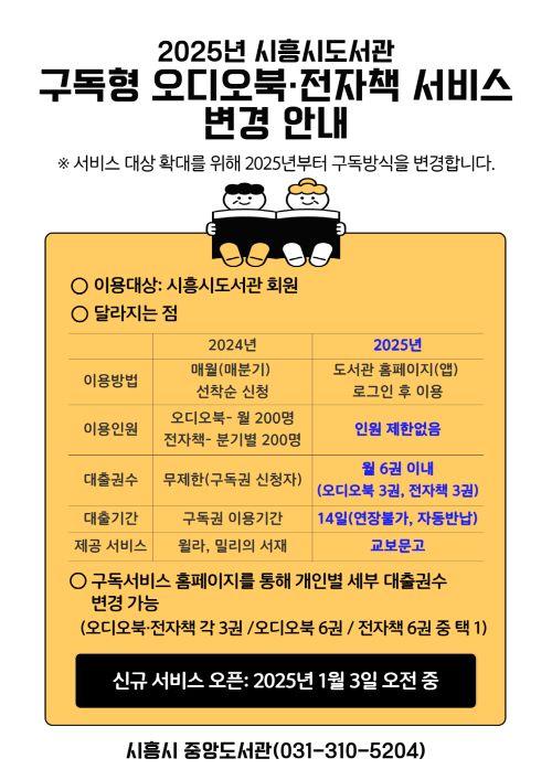 [½Åµ¿¾Æ¹æ¼Û ½ÃÈï½Ã=À̽ŵ¿±âÀÚ] ½ÃÈï½Ãµµ¼­°üÀº 2025³â 1¿ù 3ÀϺÎÅÍ ±¸µ¶Çü ¿Àµð¿ÀºÏ ¹× ÀüÀÚÃ¥ ¼­ºñ½º¸¦ È®´ë ¿î¿µÇÑ´Ù. À̹ø ±¸µ¶Çü ¼­ºñ½º È®´ë¸¦ ÅëÇØ ½Ã¹ÎµéÀº ½Å°£ ¹× º£½ºÆ®¼¿·¯ µµ¼­¸¦ ¿¹¾à ¾øÀÌ ÀÌ¿ëÇÒ ¼ö ÀÖÀ¸¸ç, ¾ðÁ¦ ¾îµð¼­³ª Æí¸®ÇÏ°Ô ÀÌ¿ëÇÒ ¼ö ÀÖ°Ô µÈ´Ù¡¦