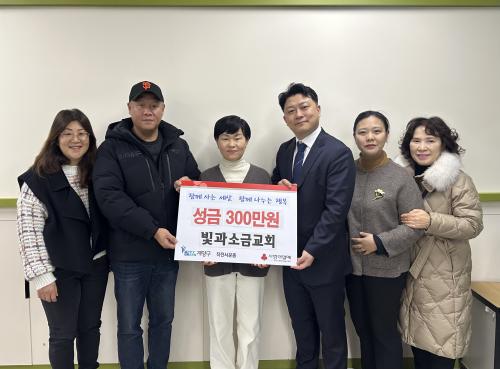 [½Åµ¿¾Æ¹æ¼Û ÀÎõ= À±¹Î½Ä±âÀÚ] ÀÎõ½Ã °è¾ç±¸ ÀÛÀü¼­¿îµ¿(µ¿Àå ¼Û¿µÈñ)Àº Áö³­ 7ÀÏ ºû°ú¼Ò±Ý±³È¸(¸ñ»ç ¹é¼öÇö)°¡ ÀÌ¿ô µ½±â ¼º±Ý 300¸¸ ¿øÀ» ±âŹÇß´Ù°í ¹àÇû´Ù. ¡®ºû°ú¼Ò±Ý±³È¸¡¯´Â ¾Õ¼­ ¼ºÅºÀý¿¡µµ Áö¿ª ³» µµ¿òÀÌ ÇÊ¿äÇÑ ÀÌ¿ô 10°¡Á¤À» ¹æ¹®ÇØ »ýÇÊǰ°ú Áö¿ø±Ý¡¦
