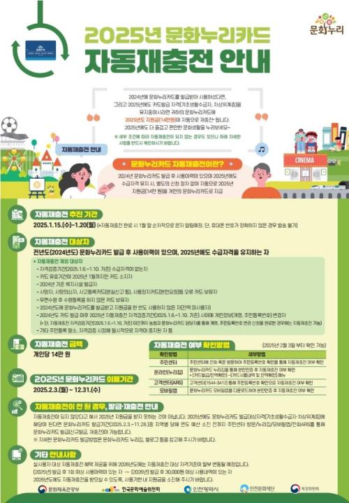 [½Åµ¿¾Æ¹æ¼Û ÀÎõ= À±¹Î½Ä±âÀÚ] ÀÎõ¹®È­Àç´ÜÀº ¹®È­´©¸®Ä«µå Áö¿ø±ÝÀÌ 2025³â 1¿ù 15ÀÏ(¼ö)ºÎÅÍ 1¿ù 20ÀÏ(¿ù)±îÁö ÀÚµ¿À¸·Î ÀçÃæÀüµÈ´Ù°í ¹àÇû´Ù. ¡Û Áö¿ø±ÝÀº Áö³­Çغ¸´Ù 1¸¸ ¿ø »óÇâµÈ 14¸¸ ¿øÀ¸·Î 2025³â¿¡µµ ¹®È­´©¸®Ä«µå ¹ß±Þ ÀÚ°ÝÀ» °è¼ÓÇØ À¯ÁöÇϰí Àִٸ顦