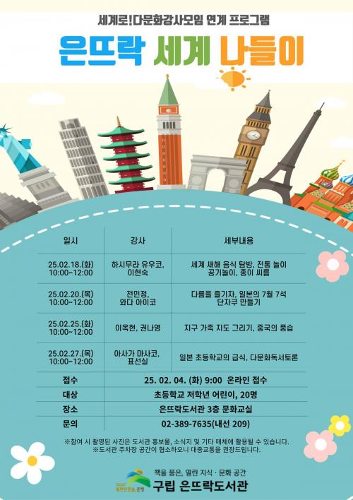 [½Åµ¿¾Æ¹æ¼Û ÀºÆò±¸=À̽ŵ¿±âÀÚ] ÀºÆò±¸´Â ±¸¸³ Àº¶ß¶ôµµ¼­°ü¿¡¼­ ´Ù¹®È­ üÇèÇÁ·Î±×·¥ ¡®Àº¶ß¶ô ¼¼°è ³ªµéÀÌ¡¯¸¦ ³»´Þ 18ÀϺÎÅÍ 27ÀϱîÁö ÃÑ 4ȸ ¿î¿µÇÑ´Ù°í ¹àÇû´Ù. ¡®Àº¶ß¶ô ¼¼°è ³ªµéÀÌ¡¯´Â ¡®¼¼°è·Î! ´Ù¹®È­ °­»ç¸ðÀÓ¡¯ µ¿¾Æ¸® Ȱµ¿ÀÇ ÀÏȯÀ¸·Î ´Ù¾çÇÑ ¹®È­Àû ¹è¡¦