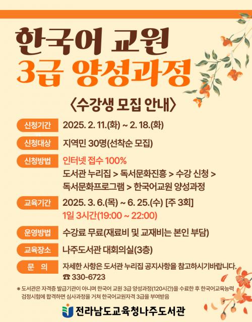Àü¶ó³²µµ±³À°Ã»³ªÁÖµµ¼­°ü, Çѱ¹¾î±³¿ø 3±Þ ¾ç¼º°úÁ¤ ¼ö°­»ý ¸ðÁý