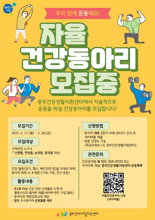 [½Åµ¿¾Æ¹æ¼Û ½ÃÈï½Ã=À̽ŵ¿±âÀÚ] ½ÃÈï½Ã´Â Áö¿ª ÁֹεéÀÌ ÀÚÀ²ÀûÀ¸·Î ¿îµ¿¿¡ Âü¿©ÇÏ´Â °Ç°­µ¿¾Æ¸®¸¦ 2¿ù 28ÀϱîÁö ¸ðÁýÇÑ´Ù. ÀÚÀ² °Ç°­µ¿¾Æ¸® Ȱµ¿¿¡´Â ½ÅÇö, ¿¬¼º, ´É°î, Àå°îµ¿ ÁֹΠ´©±¸³ª Âü¿©ÇÒ ¼ö ÀÖ´Ù. °Ç°­µ¿¾Æ¸®´Â ½ÅüȰµ¿À» ÁÖÁ¦·Î ´Ù¾çÇÑ È°µ¿À» ÅëÇØ °Ç¡¦
