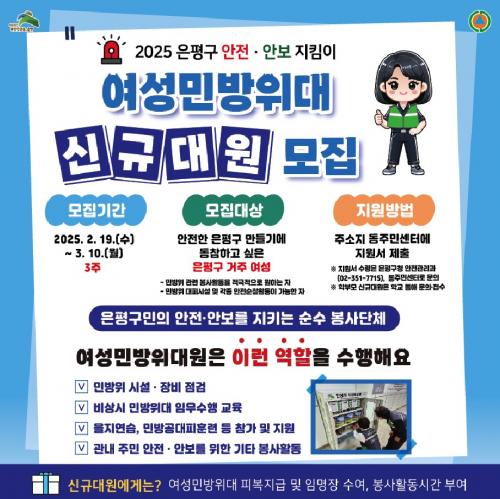 [½Åµ¿¾Æ¹æ¼Û ÀºÆò±¸=À̽ŵ¿±âÀÚ] ÀºÆò±¸´Â ÀºÆòÀÇ ¾ÈÀü°ú ¾Èº¸¸¦ ÁöŰ´Â ¼ø¼ö¿©¼ººÀ»ç´Üü ¿©¼º¹Î¹æÀ§´ë¸¦ ³»´Þ 10ÀϱîÁö ¸ðÁýÇÑ´Ù°í ¹àÇû´Ù. ¸ðÁý½Ã±â ±âÁØ ÀºÆò±¸ ¿©¼º¹Î¹æÀ§´ë¿øÀÇ Çö¿øÀº 82¸íÀÌ´Ù. ½Å±Ô ´ë¿øÀÇ Áö¿ø °¡´É Á¶°ÇÀº ±¸ÀÇ ¾ÈÀü‧¾Èº¸¸¦ À§ÇØ Àû¡¦