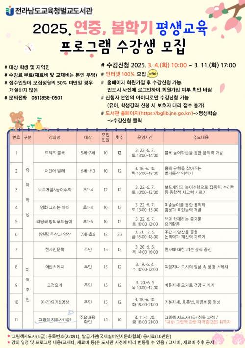 [½Åµ¿¾Æ¹æ¼Û Àü³²¹ú±³=À̽ŵ¿±âÀÚ] Àü¶ó³²µµ±³À°Ã»¹ú±³µµ¼­°üÀº 2025³â ¿¬Áß ‧ º½ÇÐ±â Æò»ý±³À° ÇÁ·Î±×·¥À» ¿À´Â 3¿ù 18ÀϺÎÅÍ ¿î¿µÇÑ´Ù. À̹ø ÇÁ·Î±×·¥Àº Æ®¸®Áî ºí·Ï, ¾î¸°ÀÌ ¹ß·¹, º¸µå°ÔÀÓ&³îÀ̼öÇÐ, ¸íÈ­ ±×¸®´Â ¾ÆÀÌ, ¸®µùÄî âÀÇǪµå³îÀÌ, (¿¬Áß)ÁÖ»ê°ú¡¦