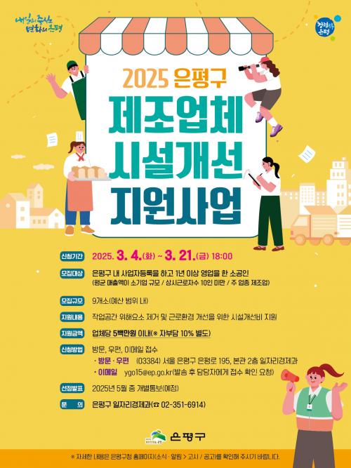 [½Åµ¿¾Æ¹æ¼Û ÀºÆò±¸=À̽ŵ¿±âÀÚ] ÀºÆò±¸´Â 4ÀϺÎÅÍ ¿À´Â 21ÀϱîÁö ¡®Á¦Á¶¾÷ü ½Ã¼³°³¼± Áö¿ø»ç¾÷¡¯¿¡ Âü¿©ÇÒ ¾÷ü¸¦ ¸ðÁýÇÑ´Ù°í ¹àÇû´Ù. ¡®Á¦Á¶¾÷ü ½Ã¼³°³¼± Áö¿ø»ç¾÷¡¯Àº ¾ÈÀüÇϰí ÄèÀûÇÑ ±Ù·Îȯ°æ Á¶¼ºÀ» À§ÇØ ¿­¾ÇÇÑ ÀÛ¾÷°ø°£ÀÇ °³¼± ºñ¿ëÀ» Áö¿øÇÏ´Â »ç¾÷ÀÌ´Ù. ¡¦