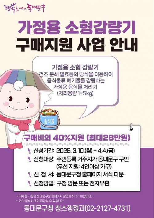 [½Åµ¿¾Æ¹æ¼Û µ¿´ë¹®±¸=À̽ŵ¿±âÀÚ] ¼­¿ï µ¿´ë¹®±¸´Â À½½Ä¹°·ù Æó±â¹° ¹èÃâ·® °¨¼Ò¸¦ À§ÇØ ¡®°¡Á¤¿ë ¼ÒÇü°¨·®±â ±¸¸Å Áö¿ø»ç¾÷¡¯À» ¿ÃÇØ óÀ½ ÃßÁøÇÑ´Ù°í 4ÀÏ ¹àÇû´Ù. °¡Á¤¿ë ¼ÒÇü°¨·®±â¶õ °ÇÁ¶¡¤ºÐ¼â¡¤¹ßÈ¿ µîÀÇ ¹æ½ÄÀ» ÀÌ¿ëÇØ À½½Ä¹°¾²·¹±â¸¦ °¨·®ÇÏ´Â ±â±â·Î, ÇϷ硦