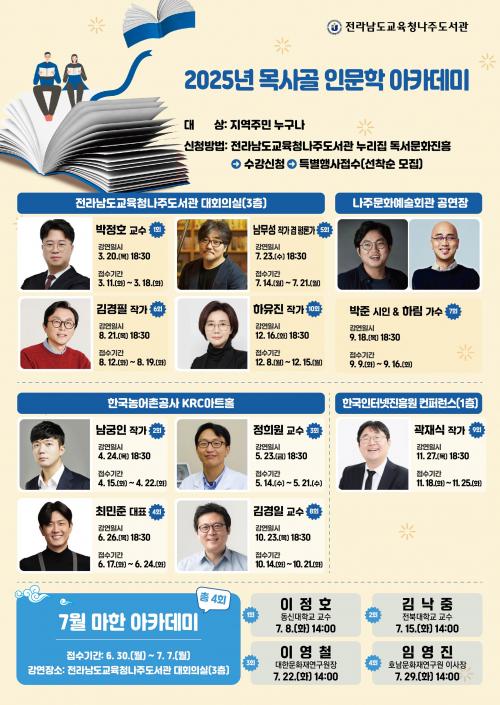 [½Åµ¿¾Æ¹æ¼Û Àü³²³ªÁÖ=À̽ŵ¿±âÀÚ] Àü¶ó³²µµ±³À°Ã»³ªÁÖµµ¼­°üÀº 3¿ù 20ÀÏ(¸ñ)ºÎÅÍ 12¿ù 16ÀÏ(È­)±îÁö Çõ½Åµµ½Ã °ø°ø±â°ü°ú Çù·ÂÇÏ¿© 2025³â ¸ñ»ç°ñ Àι®ÇÐ ¾ÆÄ«µ¥¹Ì¸¦ °³ÃÖÇÑ´Ù. Áö¿ªÁÖ¹ÎÀÇ Àι® Á¤½Å ÇÔ¾çÀ» À§ÇØ ¸¶·ÃµÈ ¡®¸ñ»ç°ñ Àι®ÇÐ ¾ÆÄ«µ¥¹Ì¡¯´Â Àι®ÇÐ °­¿¬¡¦