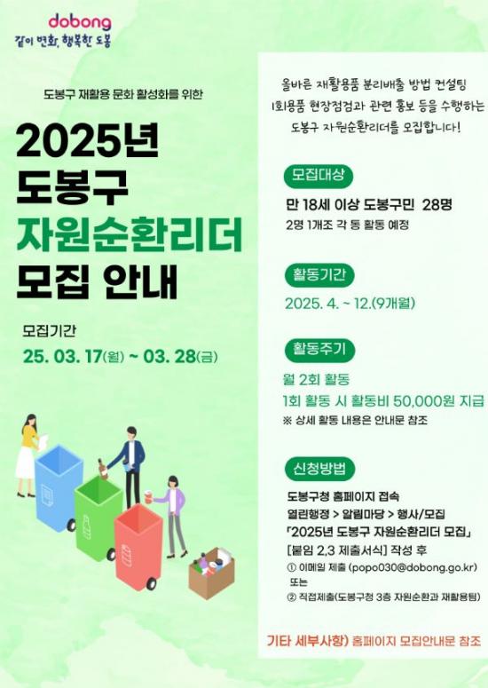 [½Åµ¿¾Æ¹æ¼Û µµºÀ±¸=À̽ŵ¿±âÀÚ] µµºÀ±¸°¡ ÃÑ 28¸íÀÇ ¡®ÀÚ¿ø¼øÈ¯¸®´õ¡¯¸¦ ¼±¹ßÇÑ´Ù. ÀÚ¿ø¼øÈ¯¸®´õ´Â 1ȸ¿ëǰ ´ë»ó»ç¾÷¼Ò ÇöÀå ¸ð´ÏÅ͸µ, ¿Ã¹Ù¸¥ ºÐ¸®¹èÃâ ¹®È­Á¤ÂøÀ» À§ÇÑ ÁֹΠÄÁ¼³ÆÃ, ÀçȰ¿ë »ç¾÷¿¡ ´ëÇÑ SNS È«º¸ µî ÀÚ¿ø¼±¼øÈ¯ ½ÇõÀ» À§ÇÑ È°µ¿À» ¼öÇàÇÑ´Ù. º»°Ý¡¦