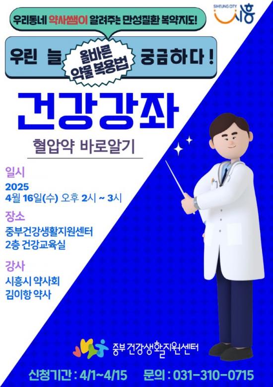 [½Åµ¿¾Æ¹æ¼Û ½ÃÈï½Ã=À̽ŵ¿±âÀÚ] ½ÃÈï½Ã Áߺΰǰ­»ýȰÁö¿ø¼¾ÅÍ´Â ¿À´Â 4¿ù 16ÀÏ ¿ÀÈÄ 2½ÃºÎÅÍ 3½Ã±îÁö ¼¾ÅÍ 2Ãþ °Ç°­±³À°½Ç¿¡¼­ ¡®Ç÷¾Ð¾à ¹Ù·Î ¾Ë±â¡¯¸¦ ÁÖÁ¦·Î °Ç°­°­Á¸¦ °³ÃÖÇÑ´Ù. À̹ø °­Á¿¡´Â ½ÃÈï½Ã ¾à»çȸ ±èÀÌÇ× ¾à»ç°¡ °­»ç·Î ³ª¼­ ¸¸¼ºÁúȯ °ü¸®¸¦ À§ÇÑ ¿Ã¹Ù¡¦