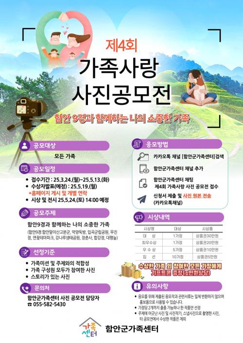 [½Åµ¿¾Æ¹æ¼Û °æ³²ÇÔ¾È=À̽ŵ¿±âÀÚ] ÇԾȱº°¡Á·¼¾ÅÍ´Â 5¿ù °¡Á¤ÀÇ ´ÞÀ» ¸ÂÀÌÇØ ¡®Á¦4ȸ °¡Á·»ç¶û »çÁø °ø¸ðÀü¡¯À» °³ÃÖÇÑ´Ù. À̹ø °ø¸ðÀüÀº ÇÔ¾È9°æÀ» ¹è°æÀ¸·Î °¡Á·°ú ÇÔ²² ÂïÀº »çÁøÀÌ¸é ´©±¸³ª Âü¿© °¡´ÉÇÏ´Ù. °ø¸ðÀüÀÇ ÁÖÁ¦´Â ÇÔ¾È9°æ°ú ÇÔ²²ÇÏ´Â ³ªÀÇ ¼ÒÁßÇÑ °¡¡¦