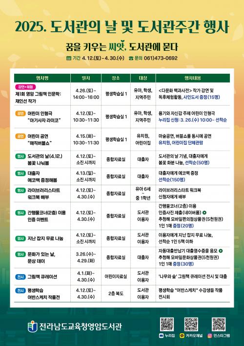 [½Åµ¿¾Æ¹æ¼Û Àü³²¿µ¾Ï=À̽ŵ¿±âÀÚ] Àü¶ó³²µµ±³À°Ã»¿µ¾Ïµµ¼­°üÀº 4¿ù 12ÀÏ µµ¼­°üÀÇ ³¯°ú µµ¼­°üÁÖ°£(4.12.~4.18.)À» ¸Â¾Æ¡®²ÞÀ» Ű¿ì´Â ¾¾¾Ñ, µµ¼­°ü¿¡ ¹¯´Ù.¡¯¶ó´Â ÁÖÁ¦·Î º½²É ³ª´²º½ µî 11°³ Çà»ç¸¦ ¿î¿µÇÑ´Ù. À¯¾Æ, Çлý, Áö¿ª¹ÎÀ» ´ë»óÀ¸·Î °­¿¬, °ø¿¬ µî ´Ùä·Î¡¦