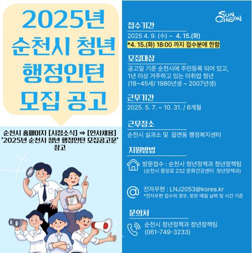 [½Åµ¿¾Æ¹æ¼Û ¼øÃµ=±è¿ëÈÆ ±âÀÚ] ¼øÃµ½Ã(½ÃÀå ³ë°ü±Ô)´Â Áö¿ª û³âµéÀÇ Ãë¾÷ °æÀï·ÂÀ» ³ôÀÌ°í ½Ç¹« °æÇèÀ» Á¦°øÇϱâ À§ÇØ ¡®2025³â ¼øÃµ û³â ÇàÁ¤ÀÎÅÏ¡¯À» ¿î¿µÇÑ´Ù°í ¹àÇû´Ù. ¼øÃµ û³â ÇàÁ¤ÀÎÅÏÀº ÇàÁ¤±â°üÀÇ ´Ù¾çÇÑ ¾÷¹«¸¦ Á÷Á¢ °æÇèÇÒ ¼ö ÀÖµµ·Ï ¸¶·ÃµÈ ÇÁ·Î±×·¥¡¦