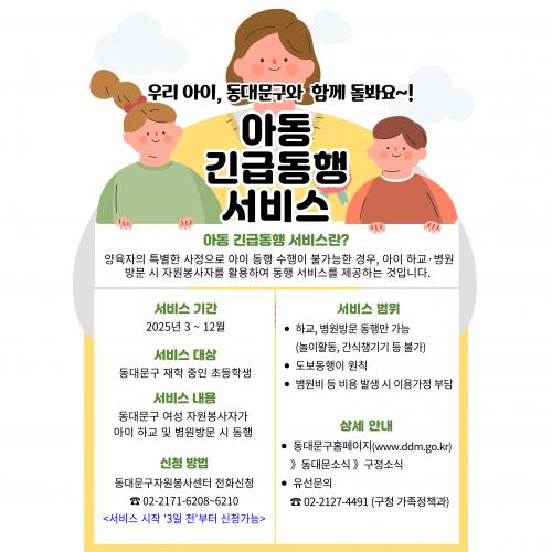 [½Åµ¿¾Æ¹æ¼Û µ¿´ë¹®±¸=À̽ŵ¿±âÀÚ] ¼­¿ï µ¿´ë¹®±¸°¡ ¾Æµ¿ ¾çÀ° °¡Á¤ÀÇ ºÎ´ãÀ» ´ú±â À§ÇØ ¿ÃÇØµµ ¡®¾Æµ¿±ä±Þµ¿Ç༭ºñ½º¡¯¸¦ ¿î¿µÇÑ´Ù. ÀÌ ¼­ºñ½º´Â º¸È£ÀÚ°¡ °©ÀÛ½º·¯¿î »çÁ¤À¸·Î ÀÚ³àÀÇ Çϱ³³ª º´¿ø ¹æ¹® µî¿¡ ÇÔ²²ÇÒ ¼ö ¾øÀ» ¶§, ÀÚ¿øºÀ»çÀÚ°¡ ¾ÆÀÌ¿Í µ¿ÇàÇÏ´Â ¹æ½Ä¡¦