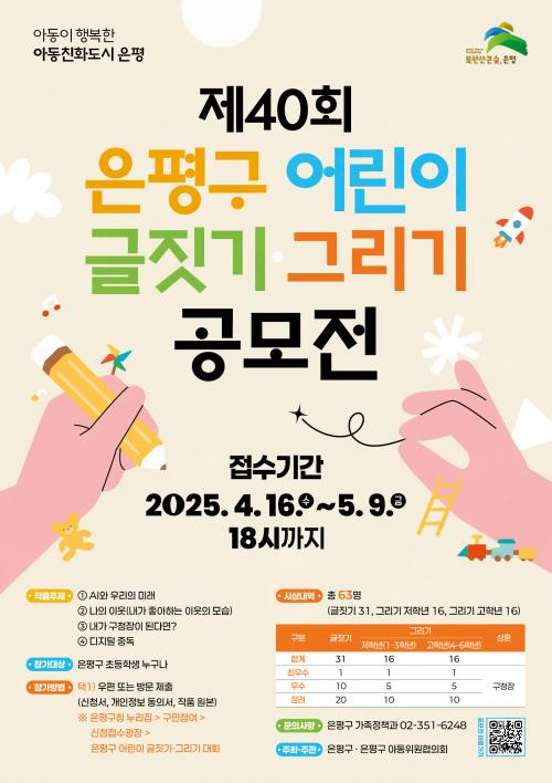 [½Åµ¿¾Æ¹æ¼Û ÀºÆò±¸=À̽ŵ¿±âÀÚ] ÀºÆò±¸´Â ¾î¸°ÀÌÁÖ°£ÀÌ ÀÖ´Â 5¿ùÀ» ¸Â¾Æ °ü³» ÃʵîÇлýÀ» ´ë»óÀ¸·Î ¡®Á¦40ȸ ÀºÆò±¸ ¾î¸°ÀÌ ±ÛÁþ±â¡¤±×¸®±â °ø¸ðÀü¡¯À» °³ÃÖÇÑ´Ù°í ¹àÇû´Ù. ¿ÃÇØ·Î 40ȸ¸¦ ¸ÂÀÌÇÑ À̹ø °ø¸ðÀüÀº ÀºÆò±¸¿Í ÀºÆò±¸ ¾Æµ¿À§¿øÇùÀÇȸ°¡ °øµ¿ ÁÖÃÖ¡¤ÁÖ°üÇÏ¡¦