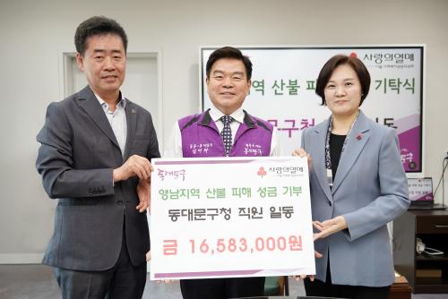 [½Åµ¿¾Æ¹æ¼Û µ¿´ë¹®±¸=À̽ŵ¿±âÀÚ] ¼­¿ï µ¿´ë¹®±¸´Â ¿µ³²±Ç ´ëÇü »êºÒ ÇÇÇØ ÁÖ¹ÎÀ» µ½±â À§ÇØ Á÷¿øµéÀÌ ¸ð±ÝÇÑ ¼º±Ý 16,583,000¿øÀ» »çȸº¹Áö°øµ¿¸ð±Ýȸ ¼­¿ïƯº°½Ã Áöȸ¿¡ ±âŹÇß´Ù°í 11ÀÏ ¹àÇû´Ù. 4¿ù 2ÀϺÎÅÍ 4ÀϱîÁö »çÈê°£ ÁøÇàµÈ À̹ø ¸ð±Ý¿¡´Â µ¿´ë¹®±¸ Àü ºÎ¡¦