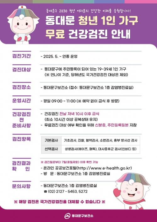 [½Åµ¿¾Æ¹æ¼Û µ¿´ë¹®±¸=À̽ŵ¿±âÀÚ] ¼­¿ï µ¿´ë¹®±¸´Â û³â 1Àΰ¡±¸ÀÇ °Ç°­ ÁõÁøÀ» À§ÇØ ¡®µ¿´ë¹® û³â 1Àΰ¡±¸ ¹«·á °Ç°­°ËÁø¡¯ »ç¾÷À» ¿ÃÇØ óÀ½À¸·Î ½ÃÇàÇÑ´Ù. À̹ø »ç¾÷Àº µ¿´ë¹®±¸¿¡ Áֹεî·ÏÀÌ µÇ¾î ÀÖ´Â 19¼¼ºÎÅÍ 39¼¼ ÀÌÇÏ(¿¬³ªÀÌ ±âÁØ)ÀÇ Ã»³â 1Àΰ¡±¸¸¦ ´ë»ó¡¦