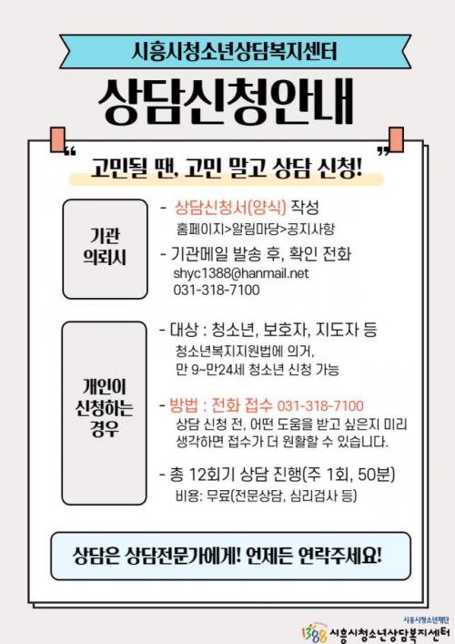 [½Åµ¿¾Æ¹æ¼Û ½ÃÈï½Ã=À̽ŵ¿±âÀÚ] ½ÃÈï½Ã´Â °ü³» û¼Ò³âÀÇ Àü¹® ½É¸®»ó´ãÀ» ÅëÇØ û¼Ò³âµéÀÇ Á¤½Å°Ç°­ ÁõÁøÀº ¹°·Ð, À§±â »óȲ¿¡ ¼±Á¦ ´ëÀÀ ÇϰíÀÚ ½ÃÈï½Ãû¼Ò³â»ó´ãº¹Áö¼¾ÅÍ(ÀÌÇÏ, ¼¾ÅÍ)¸¦ ¿î¿µÇϰí ÀÖ´Ù. ¼¾ÅÍ¿¡¼­´Â ¸¸ 9¼¼ºÎÅÍ 24¼¼ ÀÌÇÏ Ã»¼Ò³âÀ» ´ë»óÀ¸·Î °³ÀÎ ¡¦