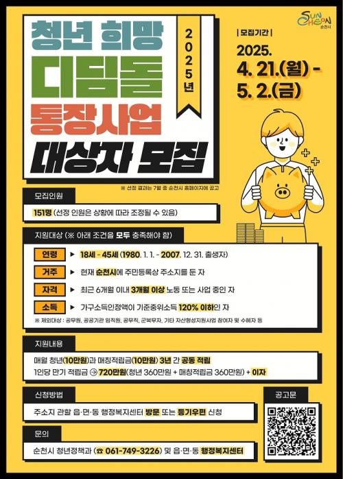 [½Åµ¿¾Æ¹æ¼Û ¼øÃµ=±è¿ëÈÆ ±âÀÚ] ¼øÃµ½Ã(½ÃÀå ³ë°ü±Ô)´Â 2025³â ¡®Ã»³â Èñ¸Áµðµõµ¹ ÅëÀå»ç¾÷¡¯ ½Å±Ô´ë»óÀÚ¸¦ 4¿ù 21ÀϺÎÅÍ 5¿ù 2ÀϱîÁö 2ÁÖ°£ ¸ðÁýÇÑ´Ù. û³â Èñ¸Áµðµõµ¹ ÅëÀå»ç¾÷Àº û³âÀÌ ¿ù 10¸¸¿øÀ» Àû¸³ÇÏ¸é ¼øÃµ½Ã¿¡¼­ 10¸¸¿øÀ» 36°³¿ù µ¿¾È ¸ÅĪ Àû¸³ÇÏ¿© ÃÑ ¡¦