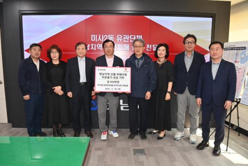 [½Åµ¿¾Æ¹æ¼Û Çϳ²½Ã=À̽ŵ¿±âÀÚ] Áö³­ 4¿ù 29ÀÏ ¹Ì»ç2µ¿ À¯°ü´Üü ¹× Á÷¿øµéÀÌ ÇÔ²² ¸ðÀº ¿µ³²Áö¿ª »êºÒ ÇÇÇØ Áö¿ø ¼º±Ý 450¸¸¿øÀ» Çϳ²½Ã¿¡ Àü´ÞÇß´Ù. À̹ø¿¡ ¸¶·ÃÇÑ ¼º±ÝÀº ¹Ì»ç2µ¿ 7°³ À¯°ü´Üü(ÅëÀå´Ü, ÁÖ¹ÎÀÚġȸ, Áö¿ª»çȸº¸ÀåÇùÀÇü, üÀ°È¸, ¹Ù¸£°Ô»ì±â¿îµ¿ ¡¦
