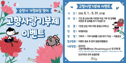 [½Åµ¿¾Æ¹æ¼Û ¼øÃµ=±è¿ëÈÆ ±âÀÚ] ¼øÃµ½Ã(½ÃÀå ³ë°ü±Ô)´Â 5¿ù °¡Á¤ÀÇ ´ÞÀ» ¸Â¾Æ ¡°¼øÃµ °íÇâ»ç¶û±âºÎÁ¦ °¡Á¤ÀÇ ´Þ ¸ÂÀÌ Æ¯º° À̺¥Æ®¡±¸¦ ÁøÇàÇÑ´Ù°í ¹àÇû´Ù. À̹ø À̺¥Æ®´Â 5¿ù 1ÀϺÎÅÍ 31ÀϱîÁö ÁøÇàµÇ¸ç, Ãß÷À» ÅëÇØ Ãß°¡ ÇýÅÃÀ» Á¦°øÇÑ´Ù. À̺¥Æ® ±â°£ µ¿¾È °íÇâ»ç¡¦