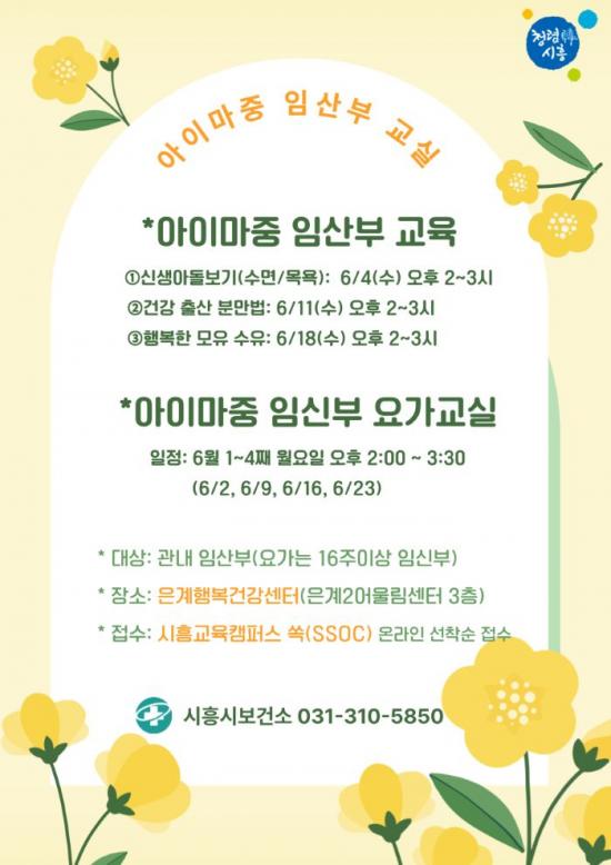 [½Åµ¿¾Æ¹æ¼Û ½ÃÈï½Ã=À̽ŵ¿±âÀÚ] ½ÃÈï½Ã´Â Ãâ»ê°ú À°¾Æ¿¡ ´ëÇÑ µÎ·Á¿òÀ» ÇØ¼ÒÇϰí, ÀÓ»êºÎµéÀÌ ´õ¿í ÇູÇÑ Ãâ»êÀ» ÁغñÇÒ ¼ö ÀÖµµ·Ï ¡®¾ÆÀ̸¶Áß¡¯ ÀÓ»êºÎ ±³½ÇÀ» ¿î¿µÇÑ´Ù. À̹ø ÇÁ·Î±×·¥Àº ¿À´Â 6¿ù 3ÀϺÎÅÍ 23ÀϱîÁö Àº°èÇູ°Ç°­¼¾ÅÍ(Àº°è2¾î¿ï¸²¼¾ÅÍ 3Ãþ)¿¡¼­ Áø¡¦