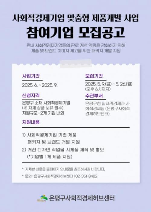 [½Åµ¿¾Æ¹æ¼Û ÀºÆò±¸=À̽ŵ¿±âÀÚ] ¼­¿ï ÀºÆò±¸´Â »çȸÀû°æÁ¦±â¾÷ »óǰÀÇ °æÀï·Â Á¦°í¿Í ºê·£µå À̹ÌÁö °­È­¸¦ À§ÇØ ¡®»çȸÀû°æÁ¦±â¾÷ ¸ÂÃãÇü Á¦Ç° °³¹ß »ç¾÷¡¯À» ÃßÁøÇÑ´Ù°í ¹àÇû´Ù. ¡®»çȸÀû°æÁ¦±â¾÷ ¸ÂÃãÇü Á¦Ç° °³¹ß »ç¾÷¡¯ ´ë»óÀº ÀÚü »óǰÀ» º¸À¯Çϰí ÀÖ´Â °ü³»¡¦
