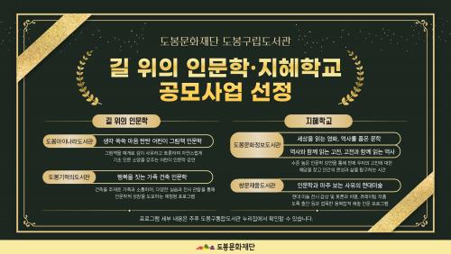 [½Åµ¿¾Æ¹æ¼Û µµºÀ±¸=À̽ŵ¿±âÀÚ] ¼­¿ï µµºÀ±¸ ±¸¸³µµ¼­°ü 4°÷ÀÌ ¹®È­Ã¼À°°ü±¤ºÎ°¡ ÁÖÃÖÇϰí Çѱ¹¹®È­¿¹¼úÀ§¿øÈ¸°¡ ÁÖ°üÇÏ´Â ¡®±æ À§ÀÇ Àι®ÇÐ ¹× ÁöÇýÇб³¡¯ °ø¸ð»ç¾÷¿¡ ¼±Á¤µÆ´Ù. À̹ø ¼±Á¤¿¡ µû¶ó ±¸¸³µµ¼­°ü¿¡¼­´Â »ç¾÷ ÃßÁø ½Ã ±¹ºñ 5õ¸¸ ¿øÀ» Áö¿ø¹Þ°Ô µÆ´Ù. ¡¦