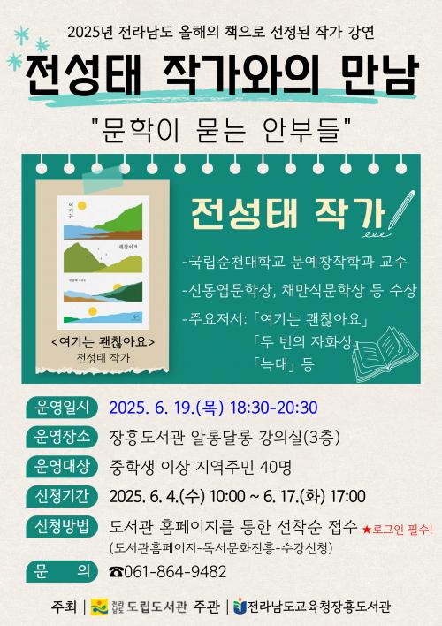 [½Åµ¿¾Æ¹æ¼Û Àü³²ÀåÈï=À̽ŵ¿±âÀÚ] Àü¶ó³²µµ±³À°Ã»ÀåÈïµµ¼­°üÀº Àü¶ó³²µµ¸³µµ¼­°üÀÌ ÁÖ°üÇÏ´Â ¡®¿ÃÇØÀÇ Ã¥ ã¾Æ°¡´Â ÀÛ°¡ °­¿¬¡¯ »ç¾÷¿¡ ¼±Á¤µÇ¾î, ¿À´Â 6¿ù 19ÀÏ 18:30¾Ö Áö¿ªÁÖ¹ÎÀ» ´ë»óÀ¸·Î Àü¼ºÅ ÀÛ°¡ ÃÊû °­¿¬À» ¿î¿µÇÑ´Ù°í ¹àÇû´Ù. Àü¼ºÅ ÀÛ°¡´Â ¡®2025³â Àü¡¦