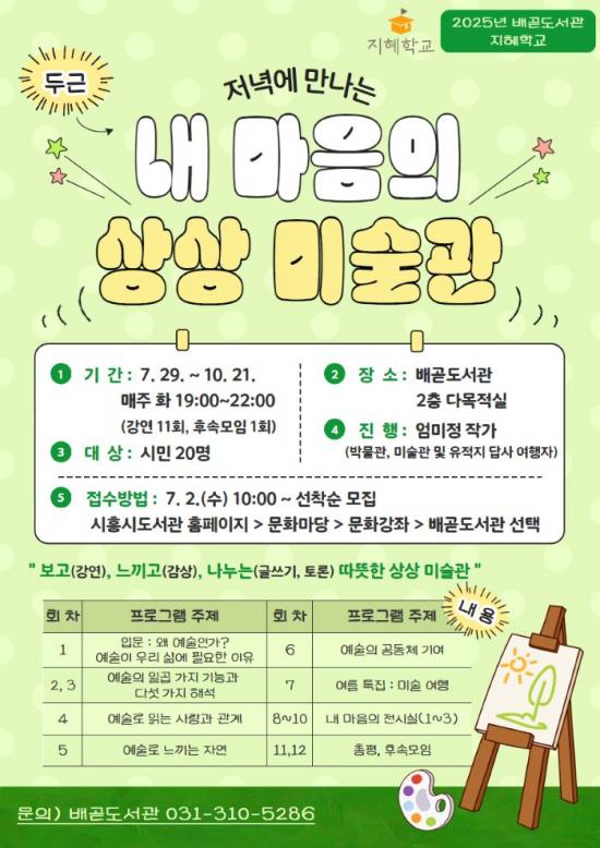 [½Åµ¿¾Æ¹æ¼Û ½ÃÈï½Ã=À̽ŵ¿±âÀÚ] ½ÃÈï½Ã ¹è°ðµµ¼­°üÀÌ ¹®È­Ã¼À°°ü±¤ºÎ°¡ ÁÖÃÖÇϰí Çѱ¹¹®È­¿¹¼úÀ§¿øÈ¸°¡ ÁÖ°üÇÏ´Â ¡®2025³â ÁöÇýÇб³¡¯ °ø¸ð»ç¾÷¿¡ ¼±Á¤µÅ 7¿ùºÎÅÍ º»°ÝÀûÀ¸·Î »ç¾÷À» ½ÃÀÛÇÑ´Ù. °ø¸ð»ç¾÷ÀÎ ¡®ÁöÇýÇб³¡¯´Â Àϻ󿡼­ Àι®Çаú Ä£¼÷ÇØÁö°í Àι®ÇÐÀû °¡¡¦