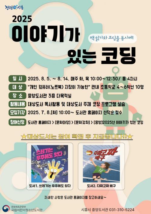 [½Åµ¿¾Æ¹æ¼Û ½ÃÈï½Ã=À̽ŵ¿±âÀÚ] ½ÃÈï½ÃÁß¾Óµµ¼­°üÀº ¿©¸§¹æÇÐÀ» ¸Â¾Æ ±¹¸³¾î¸°ÀÌû¼Ò³âµµ¼­°ü °ø¸ð»ç¾÷À¸·Î ¼±Á¤µÈ ¡®À̾߱Ⱑ ÀÖ´Â ÄÚµù¡¯ ÇÁ·Î±×·¥À» ¿À´Â 8¿ù¿¡ ¿î¿µÇÑ´Ù. À̾߱Ⱑ ÀÖ´Â ÄÚµùÀº Ã¥ Àбâ Ȱµ¿°ú ÄÚµùÀ» Á¢¸ñÇÑ Ã¢ÀÇ À¶ÇÕÇü ±³À°À¸·Î, ´ë»ó µµ¼­¡¦