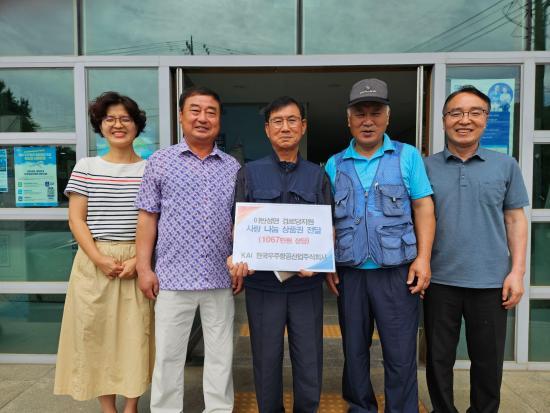 [½Åµ¿¾Æ¹æ¼Û °æ³²ÁøÁÖ=³²±Ã¿µ±â±âÀÚ] Çѱ¹Ç×°ø¿ìÁÖ»ê¾÷ÁÖ½Äȸ»ç(KAI) Á÷¿øµéÀÌ ÈûÀ» ¸ð¾Æ ¸¶·ÃÇÑ 1067¸¸ ¿ø »ó´çÀÇ »óǰ±ÇÀ» ÁøÁֽà º¹ÁöÀç´ÜÀ» ÅëÇØ À̹ݼº¸é °¢ ¸¶À»ÀÇ °æ·Î´ç¿¡ Àü´ÞÇß´Ù. KAI´Â Áö¿ª »çȸÀÇ ¾î·Á¿î ÀÌ¿ôÀ» À§ÇÑ ²ÙÁØÇÑ ³ª´® Ȱµ¿À» À̾î¿À°í ÀÖÀ¸¡¦