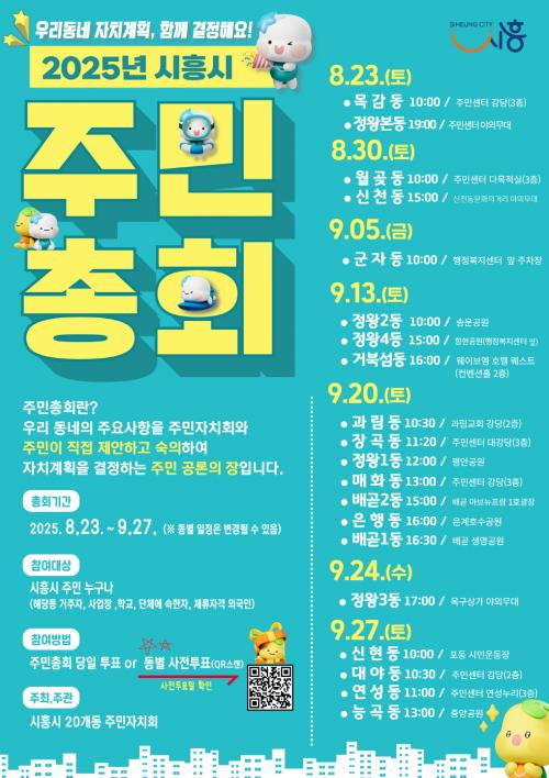 [½Åµ¿¾Æ¹æ¼Û ½ÃÈï½Ã=À̽ŵ¿±âÀÚ] ½ÃÈï½Ã´Â ÁÖ¹ÎÀÌ Á÷Á¢ ¸¶À»¿¡ ÇÊ¿äÇÑ »ç¾÷À» °áÁ¤ÇÒ ¼ö ÀÖµµ·Ï ¡®2025³â µ¿º° ÁÖ¹ÎÃÑȸ¡¯¸¦ ¿À´Â 8¿ù 23ÀϺÎÅÍ 9¿ù 27ÀϱîÁö 20°³ µ¿¿¡¼­ Â÷·Ê´ë·Î ÁøÇàÇÑ´Ù. ÁÖ¹ÎÃÑȸ´Â ÁÖ¹ÎÀÚġȸ°¡ ÁÖ°üÇÏ´Â °ø·ÐÀÇ ÀåÀ¸·Î, ÁÖ¹ÎÀÌ ¹ß±¼ÇÑ ¸¶À»»ç¡¦