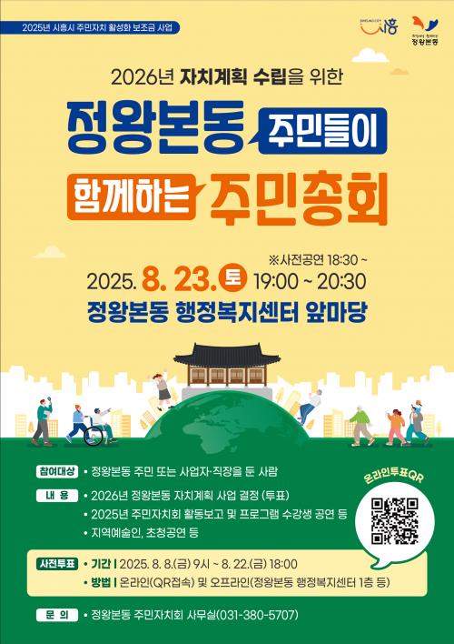 [½Åµ¿¾Æ¹æ¼Û ½ÃÈï½Ã=À̽ŵ¿±âÀÚ] ½ÃÈï½Ã Á¤¿Õº»µ¿ ÁÖ¹ÎÀÚġȸ°¡ 8¿ù 23ÀÏ ¿ÀÈÄ 7½Ã Á¤¿Õº»µ¿ÇàÁ¤º¹Áö¼¾ÅÍ ¾Õ¸¶´ç¿¡¼­ Á¤¿Õº»µ¿ ÁÖ¹ÎÃÑȸ¸¦ °³ÃÖÇÑ´Ù. À̹ø ÁÖ¹ÎÃÑȸ´Â 2025³â¿¡ ÃßÁøµÈ ÀÚÄ¡°èȹ °æ°ú¸¦ °øÀ¯Çϰí, 2026³âµµ »ç¾÷¿¡ ´ëÇÑ ÁÖ¹ÎÅõÇ¥¸¦ ÁøÇàÇÏ´Â ÀÚ¸®·Î, ¡¦