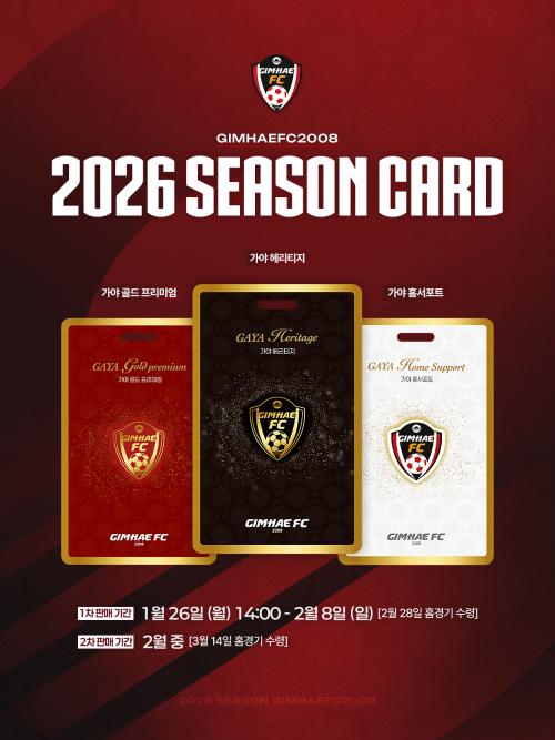 [½Åµ¿¾Æ¹æ¼Û °æ³²±èÇØ=³²±Ã¿µ±â±âÀÚ] K¸®±×2 Á¤½Ä Âü°¡°¡ È®Á¤µÈ ±èÇØFC2008(ÀÌÇÏ¡®±èÇØFC¡¯)ÀÌ 2026³â ½ÃÁð±Ç ÆÇ¸Å¸¦ °ø½Ä ¹ßÇ¥Çß´Ù. ÆÒµéÀÇ ¼º¿ø°ú ¿­Á¤À» º»°ÝÀûÀÎ ½ÃÁðÀÇ ¿¡³ÊÁö¿øÀ¸·Î »ï±â À§ÇØ ¸¶·ÃµÈ À̹ø ƼÄÏÀº ½ÃÁð±Ç 1Á¾, ¸â¹ö½Ê 2Á¾À¸·Î ±¸¼ºµÇ¾ú´Ù. ±è¡¦