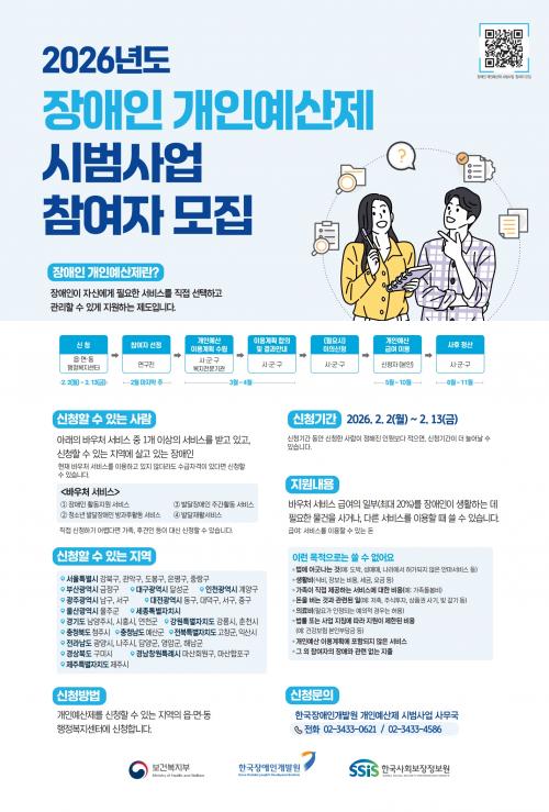 [½Åµ¿¾Æ¹æ¼Û ½ÃÈï½Ã=À̽ŵ¿±âÀÚ] ½ÃÈï½Ã´Â 2¿ù 2ÀϺÎÅÍ 13ÀϱîÁö ¡®2026³â Àå¾ÖÀÎ °³ÀÎ ¿¹»êÁ¦ ½Ã¹ü»ç¾÷¡¯ Âü¿©ÀÚ¸¦ ¸ðÁýÇÑ´Ù. Àå¾ÖÀÎ °³ÀÎ ¿¹»êÁ¦´Â Àå¾ÖÀÎÀÌ Àڽſ¡°Ô ÇÊ¿äÇÑ ¼­ºñ½º¸¦ Á÷Á¢ ¼±ÅÃÇÏ°í °ü¸®ÇÒ ¼ö ÀÖ°Ô Áö¿øÇÏ´Â Á¦µµ´Ù. Âü¿©ÀÚ´Â ÀÚ½ÅÀÇ Àå¾ÖÀÎ ¹Ù¿ì¡¦