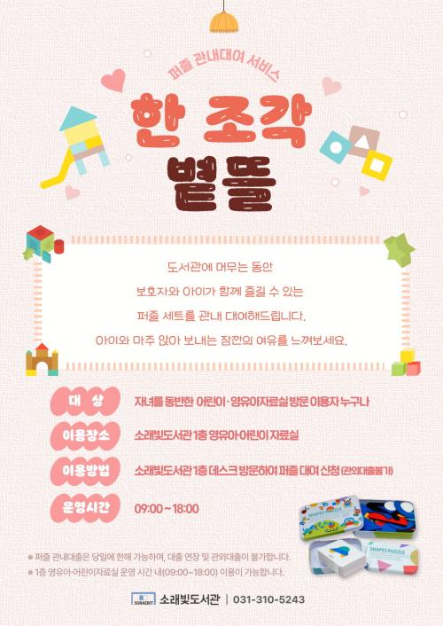 [½Åµ¿¾Æ¹æ¼Û ½ÃÈï½Ã=À̽ŵ¿±âÀÚ] ½ÃÈï½Ã ¼Ò·¡ºûµµ¼­°üÀº ¾î¸°À̸¦ À§ÇÑ °ü³» ÆÛÁñ ´ë¿© ¼­ºñ½º ¡®ÇÑ Á¶°¢ ºµ¶ã¡¯À» »õ·Ó°Ô ¼±º¸ÀδÙ. ÀÌ ¼­ºñ½º´Â ºü¸¥ ¿µ»ó°ú Áï°¢ÀûÀÎ Àڱؿ¡ Àͼ÷ÇØÁø ¾ÆÀ̵éÀÌ Àá½Ã ¼Óµµ¸¦ ´ÊÃß°í, ¼Õ³¡ °¨°¢°ú ÁýÁß·ÂÀ» ÀÚ¿¬½º·´°Ô ±â¸¦ ¼ö ÀÖµµ·Ï ¡¦