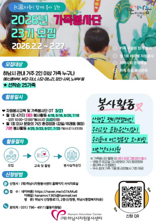 [½Åµ¿¾Æ¹æ¼Û Çϳ²½Ã=À̽ŵ¿±âÀÚ] (Àç)Çϳ²½ÃÀÚ¿øºÀ»ç¼¾ÅÍ´Â °¡Á·ÀÌ ÇÔ²² Âü¿©ÇÏ´Â ÀÚ¿øºÀ»ç ÇÁ·Î±×·¥ÀΡ®Á¦23±â Çϳ²½ÃÀÚ¿øºÀ»ç¼¾ÅÍ °¡Á·ºÀ»ç´Ü¡¯Âü¿© °¡Á·À» ¼±Âø¼ø 25°¡Á· ¸ðÁýÇÑ´Ù. ¸ðÁý ´ë»óÀº Çϳ²½Ã¿¡ °ÅÁÖÇÏ´Â 2ÀÎ ÀÌ»óÀÇ °¡Á·À̸ç, Á¢¼ö´Â 2026³â 2¿ù 27ÀÏ(±Ý¡¦